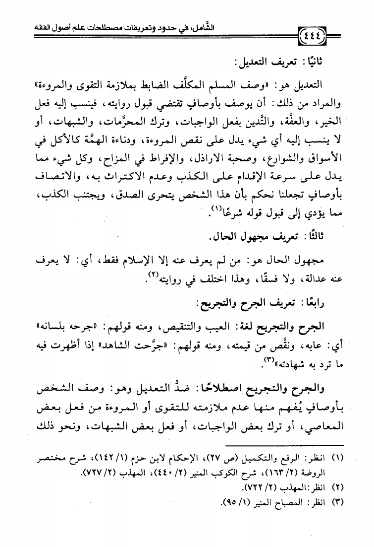 نام کتاب : الشامل في حدود وتعريفات مصطلحات علم أصول الفقه وشرح صحيحها وبيان ضعيفها والفروق بين المتشابه منها دراسة تأصيلية استقرائية نقدية نویسنده : عبد الكريم بن علي بن محمد النملة جلد : 1 صفحه : 444
