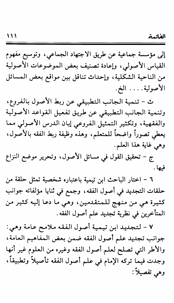 نام کتاب : تجديد أصول الفقه ومعالمه عند شيخ الإسلام ابن تيمية ويليه المنحى التطبيقي للقياس الأصولي وصلته بالإجتهاد المعاصر نویسنده : محمد خالد منصور جلد : 1 صفحه : 111