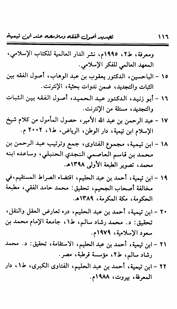 نام کتاب : تجديد أصول الفقه ومعالمه عند شيخ الإسلام ابن تيمية ويليه المنحى التطبيقي للقياس الأصولي وصلته بالإجتهاد المعاصر نویسنده : محمد خالد منصور جلد : 1 صفحه : 116