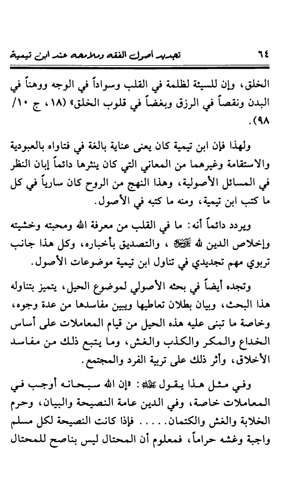 نام کتاب : تجديد أصول الفقه ومعالمه عند شيخ الإسلام ابن تيمية ويليه المنحى التطبيقي للقياس الأصولي وصلته بالإجتهاد المعاصر نویسنده : محمد خالد منصور جلد : 1 صفحه : 64