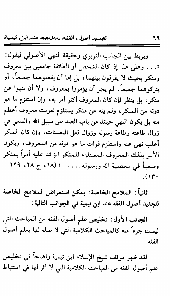 نام کتاب : تجديد أصول الفقه ومعالمه عند شيخ الإسلام ابن تيمية ويليه المنحى التطبيقي للقياس الأصولي وصلته بالإجتهاد المعاصر نویسنده : محمد خالد منصور جلد : 1 صفحه : 66