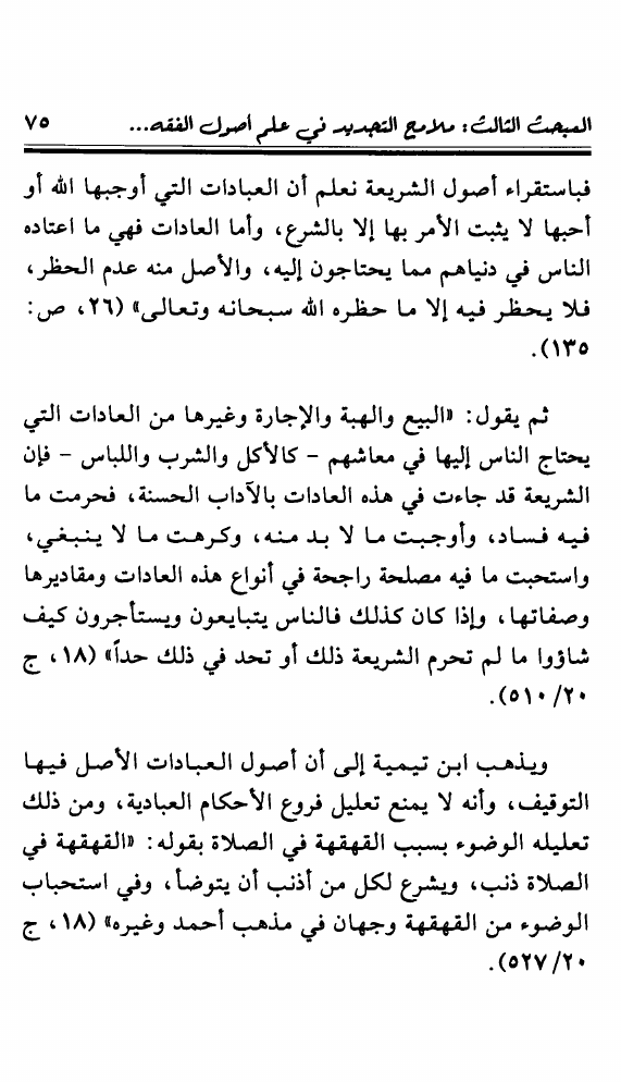 نام کتاب : تجديد أصول الفقه ومعالمه عند شيخ الإسلام ابن تيمية ويليه المنحى التطبيقي للقياس الأصولي وصلته بالإجتهاد المعاصر نویسنده : محمد خالد منصور جلد : 1 صفحه : 75