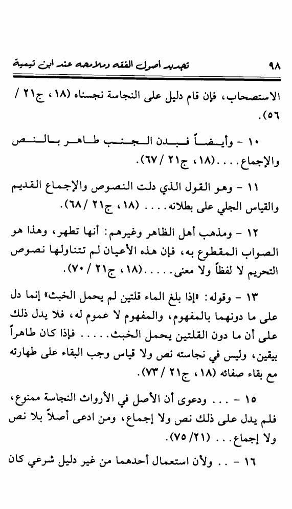 نام کتاب : تجديد أصول الفقه ومعالمه عند شيخ الإسلام ابن تيمية ويليه المنحى التطبيقي للقياس الأصولي وصلته بالإجتهاد المعاصر نویسنده : محمد خالد منصور جلد : 1 صفحه : 98
