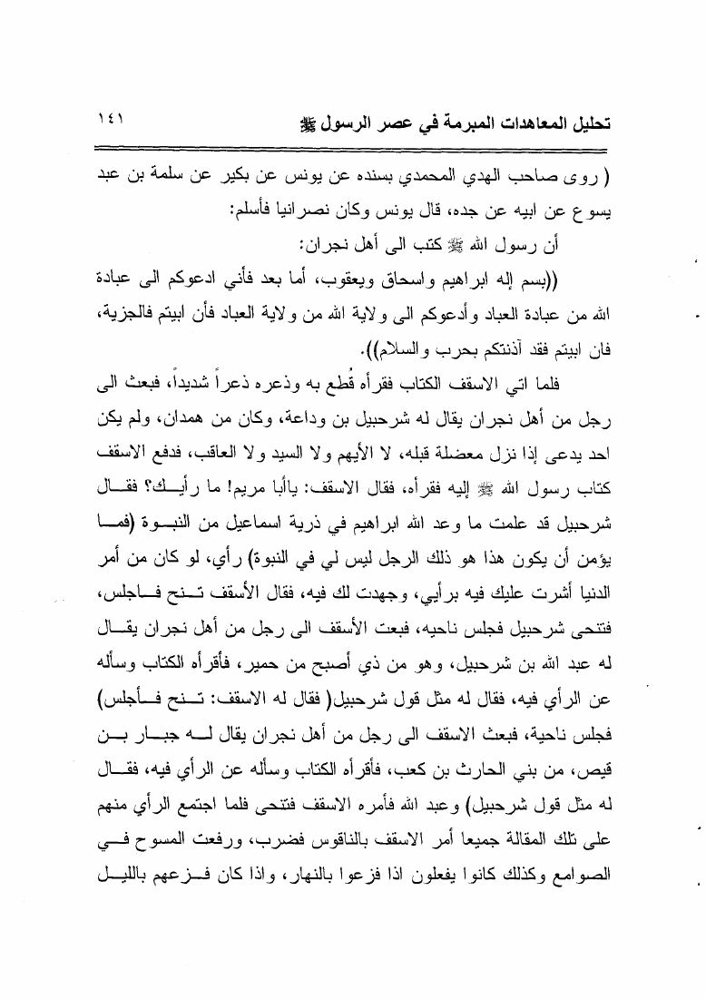 نام کتاب : أحكام المعاهدات فى الشريعة الإسلامية تحليل المعاهدات المبرمة في عصر الرسول صلى الله عليه وسلم نویسنده : خالد رشيد الجميلي جلد : 1 صفحه : 141