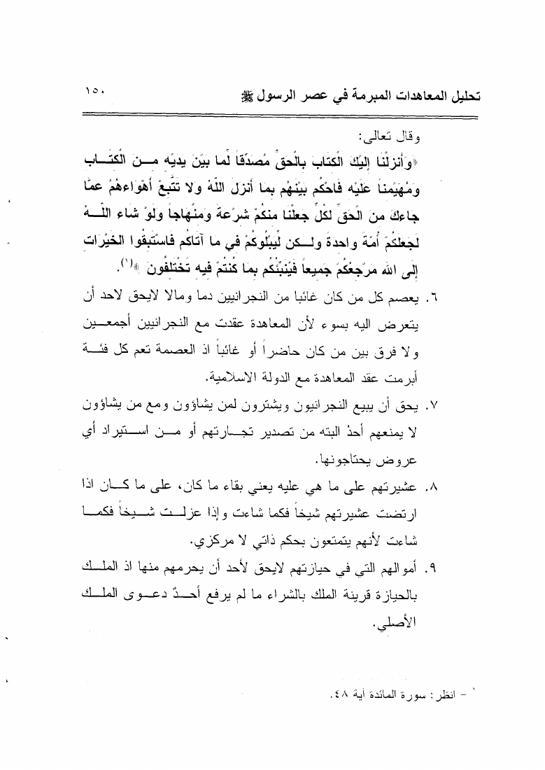 نام کتاب : أحكام المعاهدات فى الشريعة الإسلامية تحليل المعاهدات المبرمة في عصر الرسول صلى الله عليه وسلم نویسنده : خالد رشيد الجميلي جلد : 1 صفحه : 150