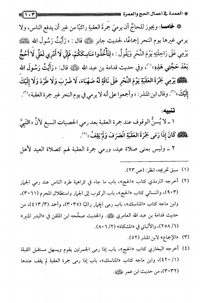 نام کتاب : العمدة فى أعمال الحج والعمرة ومعه نصيحة بين يدي الحاج والمعتمر، فتاوى في الحج والعمرة نویسنده : محمد علي فركوس أبو عبد المعز جلد : 1 صفحه : 103