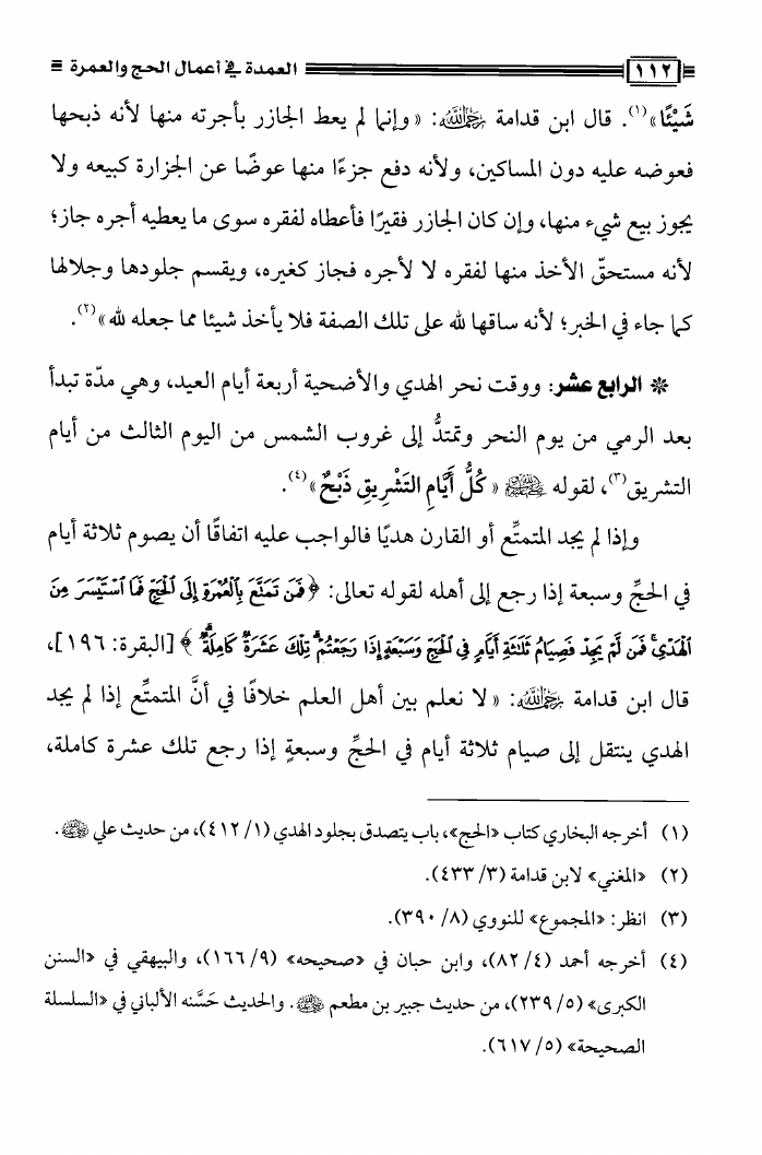 نام کتاب : العمدة فى أعمال الحج والعمرة ومعه نصيحة بين يدي الحاج والمعتمر، فتاوى في الحج والعمرة نویسنده : محمد علي فركوس أبو عبد المعز جلد : 1 صفحه : 112