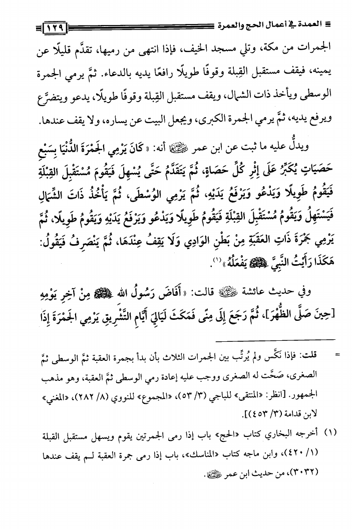 نام کتاب : العمدة فى أعمال الحج والعمرة ومعه نصيحة بين يدي الحاج والمعتمر، فتاوى في الحج والعمرة نویسنده : محمد علي فركوس أبو عبد المعز جلد : 1 صفحه : 129