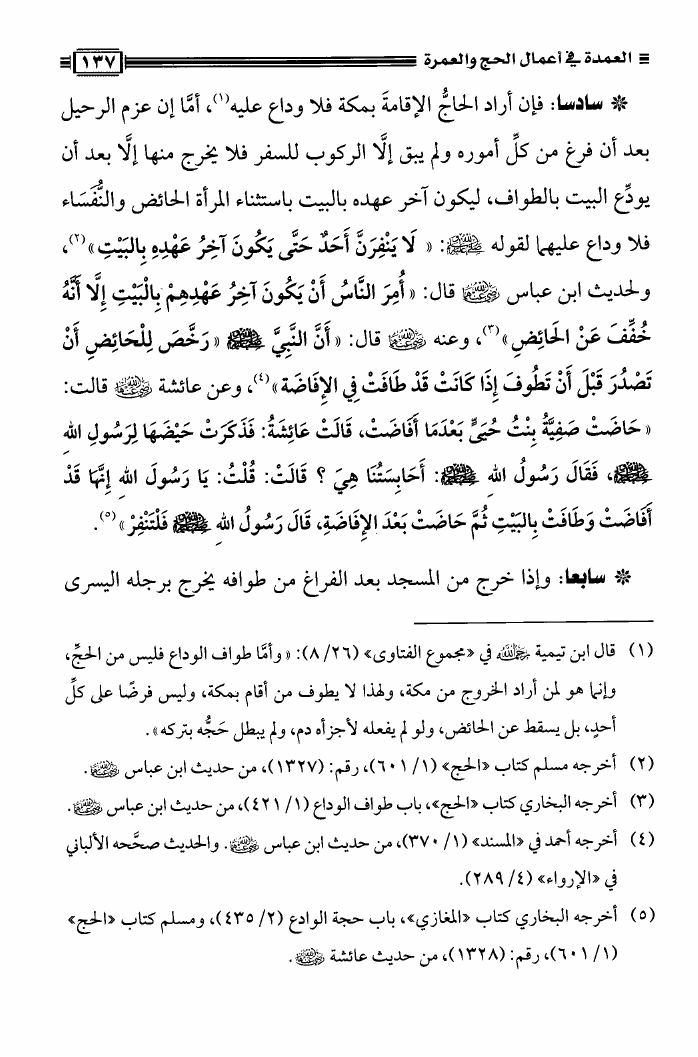 نام کتاب : العمدة فى أعمال الحج والعمرة ومعه نصيحة بين يدي الحاج والمعتمر، فتاوى في الحج والعمرة نویسنده : محمد علي فركوس أبو عبد المعز جلد : 1 صفحه : 137