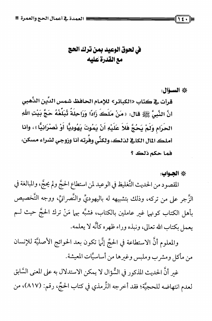 نام کتاب : العمدة فى أعمال الحج والعمرة ومعه نصيحة بين يدي الحاج والمعتمر، فتاوى في الحج والعمرة نویسنده : محمد علي فركوس أبو عبد المعز جلد : 1 صفحه : 140