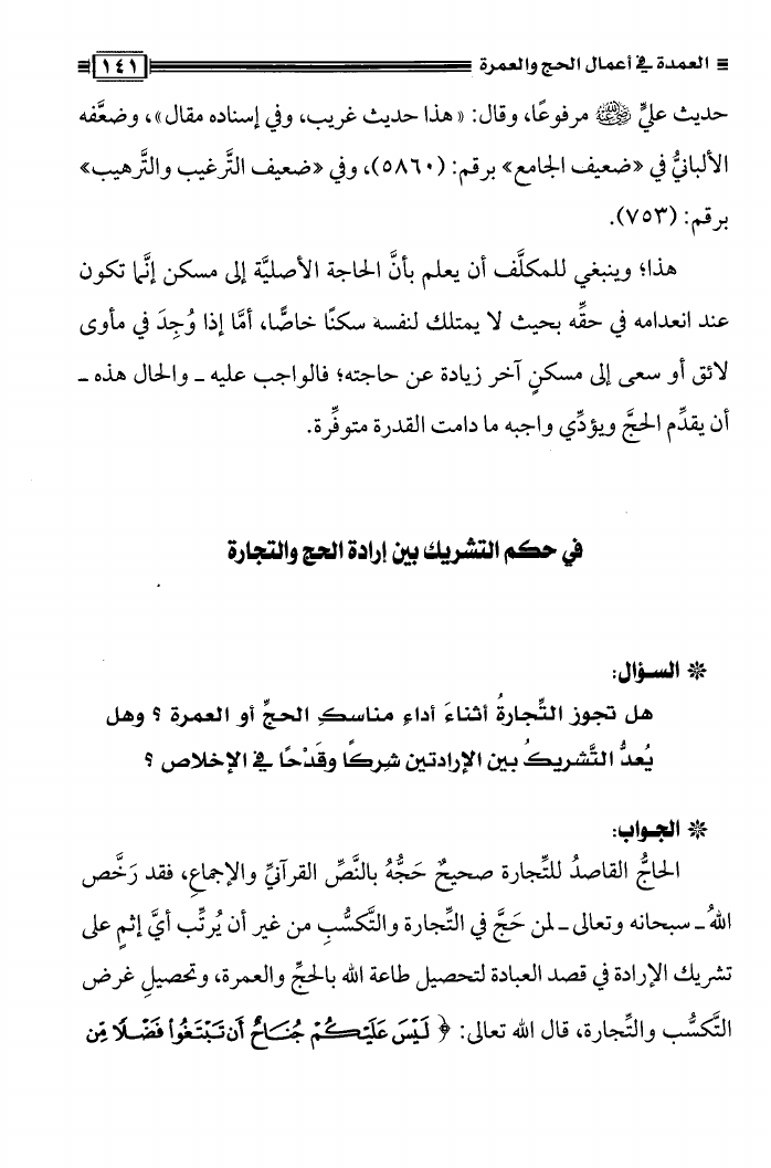 نام کتاب : العمدة فى أعمال الحج والعمرة ومعه نصيحة بين يدي الحاج والمعتمر، فتاوى في الحج والعمرة نویسنده : محمد علي فركوس أبو عبد المعز جلد : 1 صفحه : 141