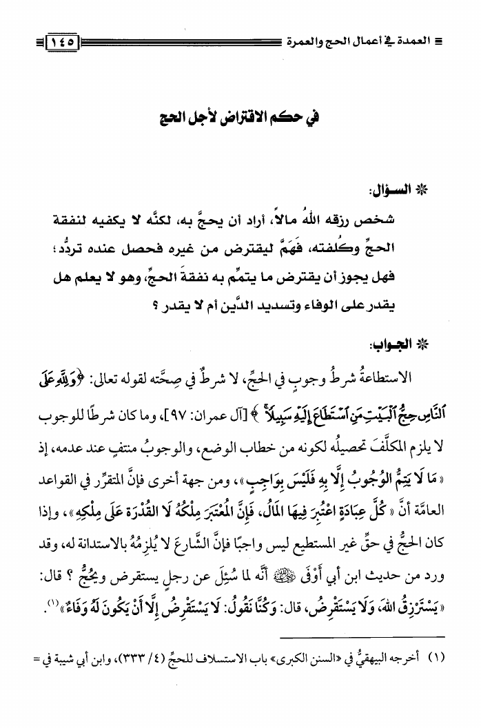 نام کتاب : العمدة فى أعمال الحج والعمرة ومعه نصيحة بين يدي الحاج والمعتمر، فتاوى في الحج والعمرة نویسنده : محمد علي فركوس أبو عبد المعز جلد : 1 صفحه : 145