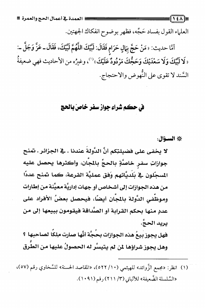 نام کتاب : العمدة فى أعمال الحج والعمرة ومعه نصيحة بين يدي الحاج والمعتمر، فتاوى في الحج والعمرة نویسنده : محمد علي فركوس أبو عبد المعز جلد : 1 صفحه : 148