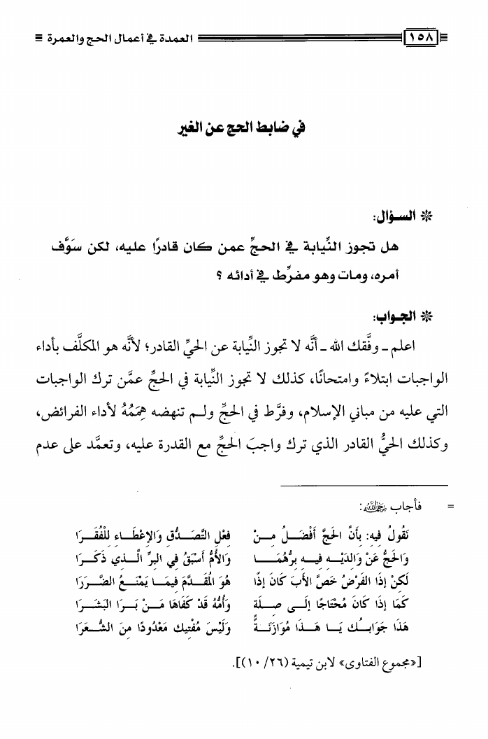 نام کتاب : العمدة فى أعمال الحج والعمرة ومعه نصيحة بين يدي الحاج والمعتمر، فتاوى في الحج والعمرة نویسنده : محمد علي فركوس أبو عبد المعز جلد : 1 صفحه : 158