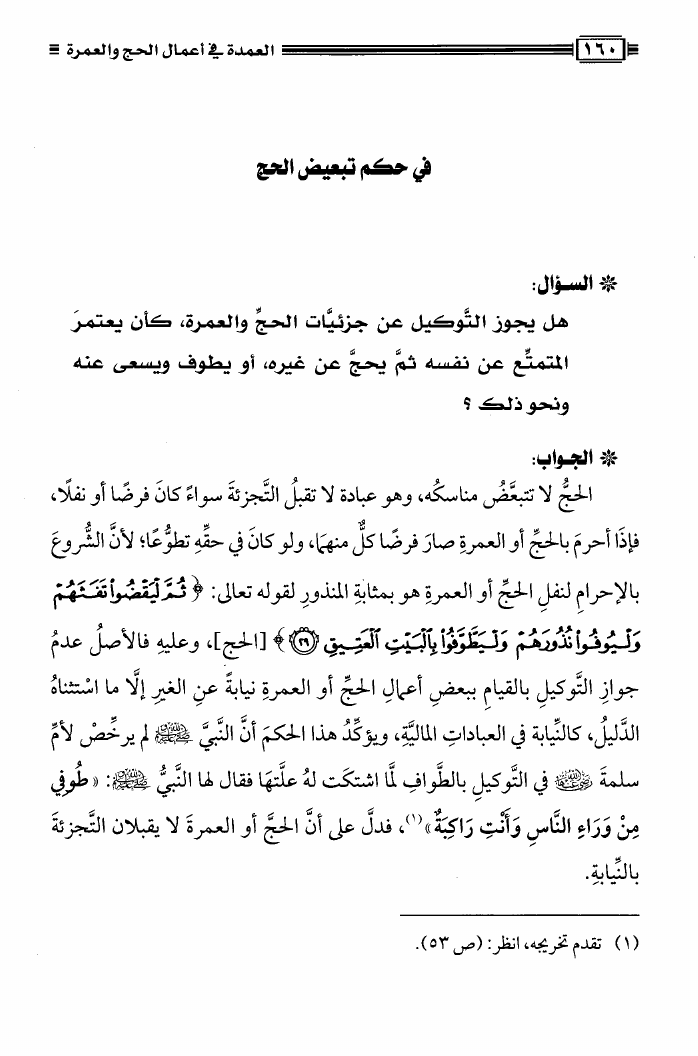 نام کتاب : العمدة فى أعمال الحج والعمرة ومعه نصيحة بين يدي الحاج والمعتمر، فتاوى في الحج والعمرة نویسنده : محمد علي فركوس أبو عبد المعز جلد : 1 صفحه : 160