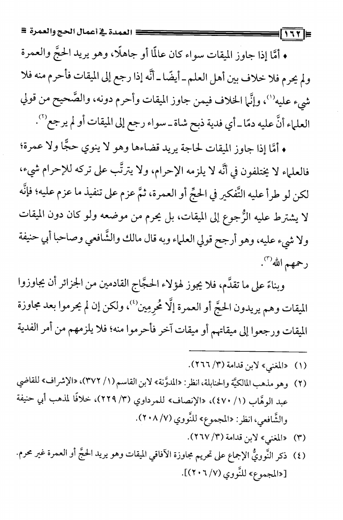 نام کتاب : العمدة فى أعمال الحج والعمرة ومعه نصيحة بين يدي الحاج والمعتمر، فتاوى في الحج والعمرة نویسنده : محمد علي فركوس أبو عبد المعز جلد : 1 صفحه : 162