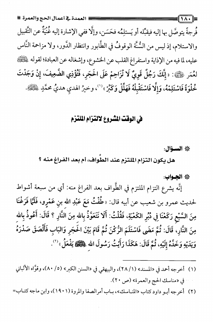 نام کتاب : العمدة فى أعمال الحج والعمرة ومعه نصيحة بين يدي الحاج والمعتمر، فتاوى في الحج والعمرة نویسنده : محمد علي فركوس أبو عبد المعز جلد : 1 صفحه : 180