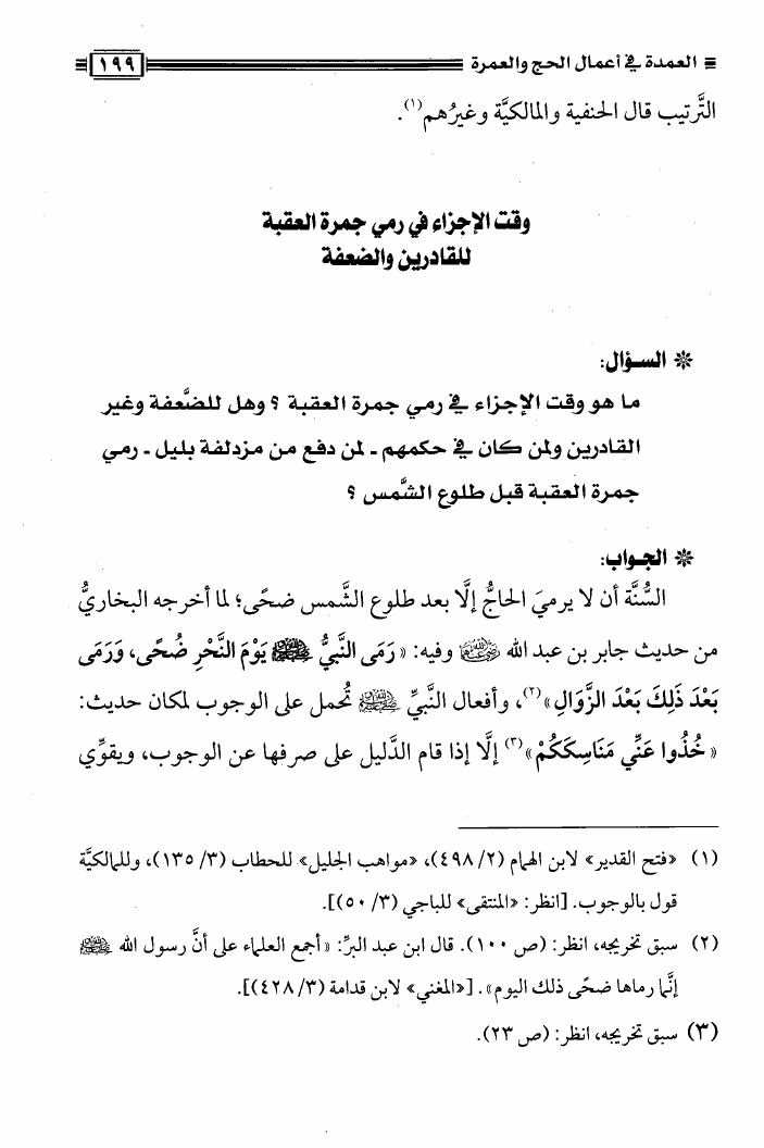 نام کتاب : العمدة فى أعمال الحج والعمرة ومعه نصيحة بين يدي الحاج والمعتمر، فتاوى في الحج والعمرة نویسنده : محمد علي فركوس أبو عبد المعز جلد : 1 صفحه : 199