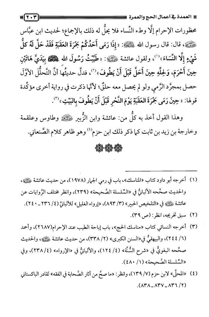 نام کتاب : العمدة فى أعمال الحج والعمرة ومعه نصيحة بين يدي الحاج والمعتمر، فتاوى في الحج والعمرة نویسنده : محمد علي فركوس أبو عبد المعز جلد : 1 صفحه : 203