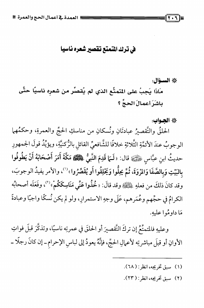 نام کتاب : العمدة فى أعمال الحج والعمرة ومعه نصيحة بين يدي الحاج والمعتمر، فتاوى في الحج والعمرة نویسنده : محمد علي فركوس أبو عبد المعز جلد : 1 صفحه : 206
