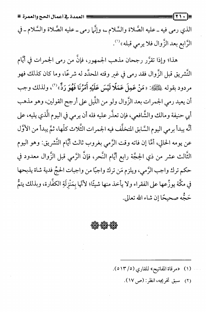 نام کتاب : العمدة فى أعمال الحج والعمرة ومعه نصيحة بين يدي الحاج والمعتمر، فتاوى في الحج والعمرة نویسنده : محمد علي فركوس أبو عبد المعز جلد : 1 صفحه : 210