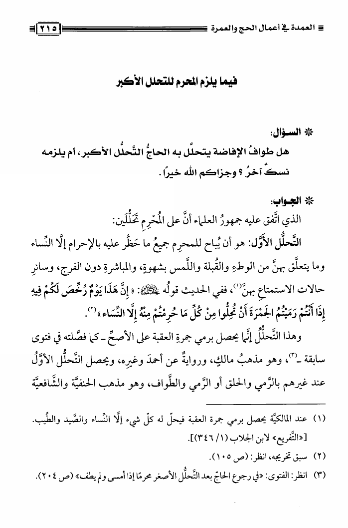 نام کتاب : العمدة فى أعمال الحج والعمرة ومعه نصيحة بين يدي الحاج والمعتمر، فتاوى في الحج والعمرة نویسنده : محمد علي فركوس أبو عبد المعز جلد : 1 صفحه : 215