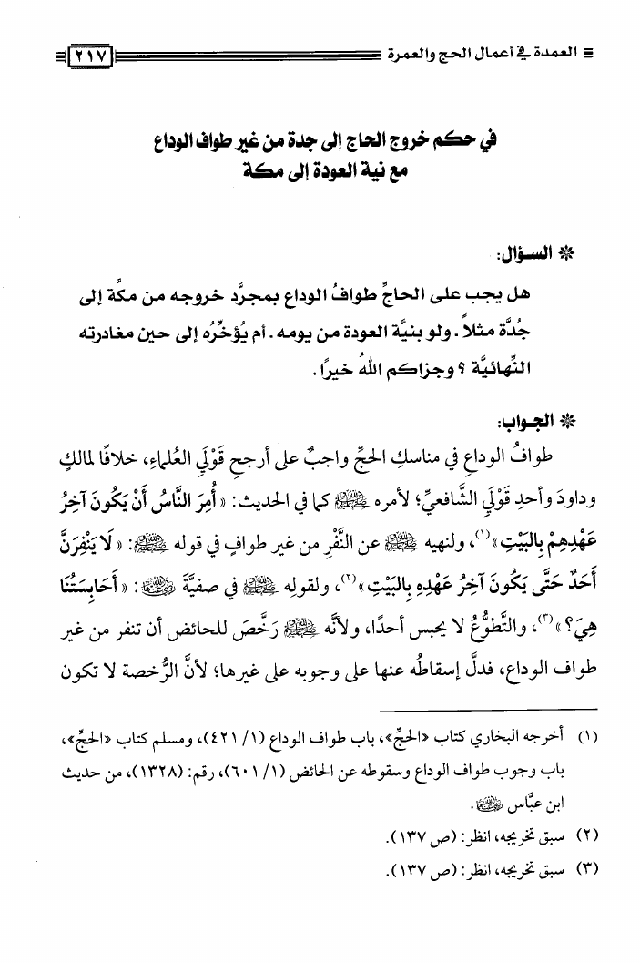 نام کتاب : العمدة فى أعمال الحج والعمرة ومعه نصيحة بين يدي الحاج والمعتمر، فتاوى في الحج والعمرة نویسنده : محمد علي فركوس أبو عبد المعز جلد : 1 صفحه : 217