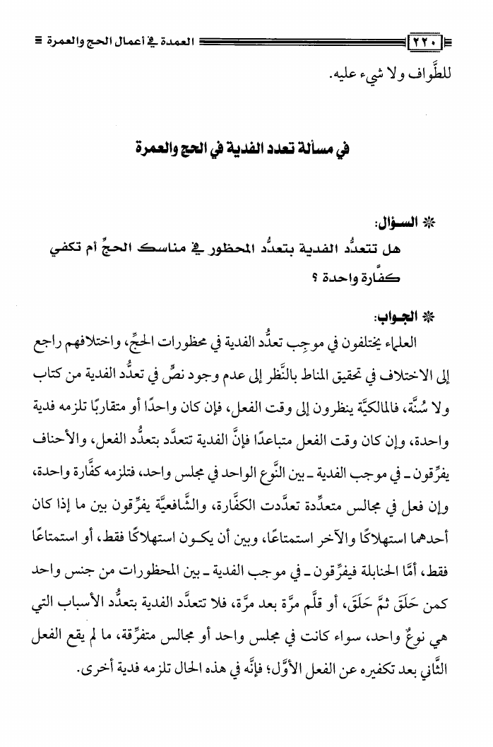 نام کتاب : العمدة فى أعمال الحج والعمرة ومعه نصيحة بين يدي الحاج والمعتمر، فتاوى في الحج والعمرة نویسنده : محمد علي فركوس أبو عبد المعز جلد : 1 صفحه : 220