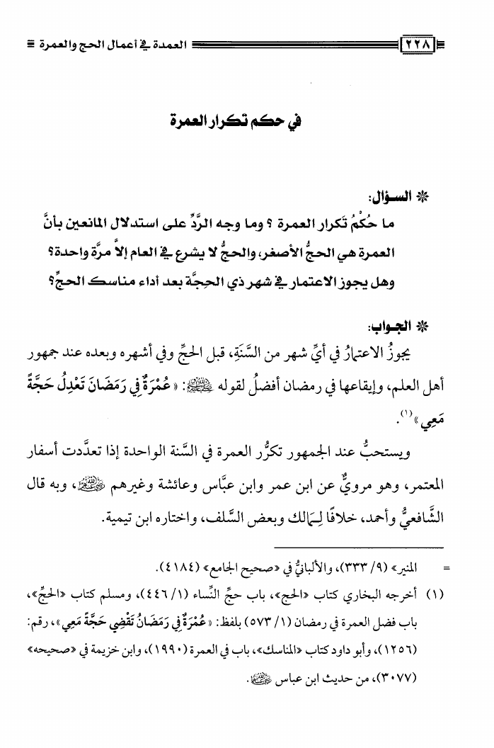 نام کتاب : العمدة فى أعمال الحج والعمرة ومعه نصيحة بين يدي الحاج والمعتمر، فتاوى في الحج والعمرة نویسنده : محمد علي فركوس أبو عبد المعز جلد : 1 صفحه : 228