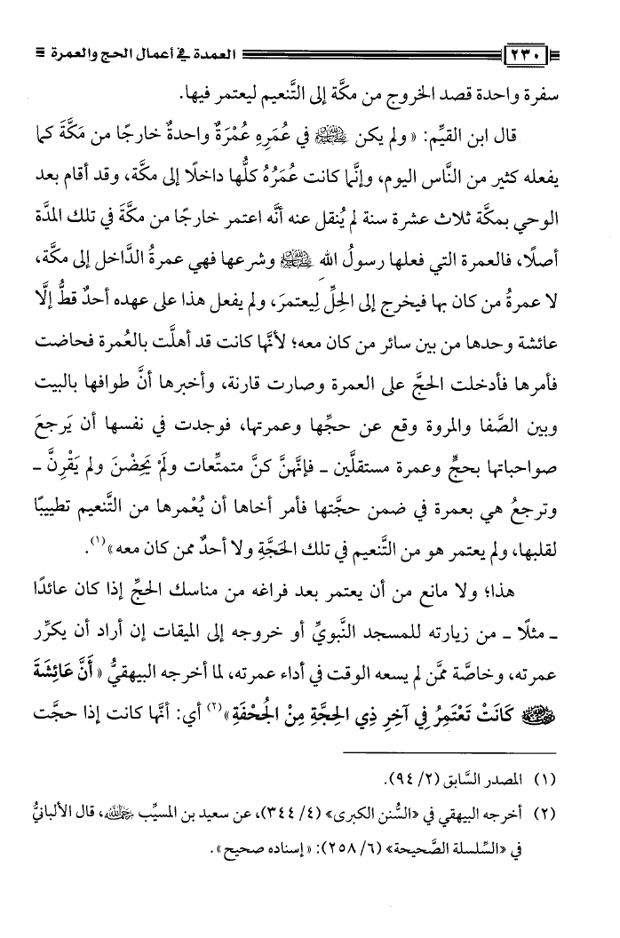 نام کتاب : العمدة فى أعمال الحج والعمرة ومعه نصيحة بين يدي الحاج والمعتمر، فتاوى في الحج والعمرة نویسنده : محمد علي فركوس أبو عبد المعز جلد : 1 صفحه : 230