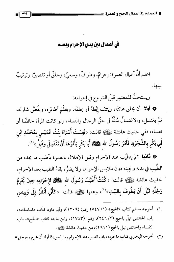 نام کتاب : العمدة فى أعمال الحج والعمرة ومعه نصيحة بين يدي الحاج والمعتمر، فتاوى في الحج والعمرة نویسنده : محمد علي فركوس أبو عبد المعز جلد : 1 صفحه : 39