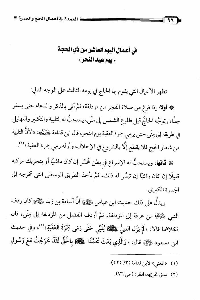 نام کتاب : العمدة فى أعمال الحج والعمرة ومعه نصيحة بين يدي الحاج والمعتمر، فتاوى في الحج والعمرة نویسنده : محمد علي فركوس أبو عبد المعز جلد : 1 صفحه : 96