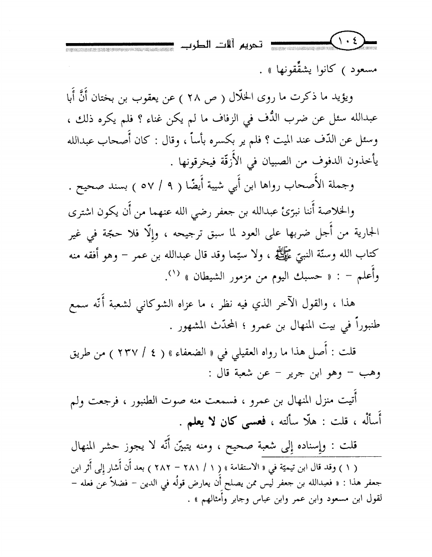 نام کتاب : تحريم آلات الطرب أو الرد بالوحيين وأقوال أئمتنا على ابن حزم ومقلديه المبيحين للمعازف والغنا وعلى الصوفيين الذين اتخذوه قربة ودينا نویسنده : محمد ناصر الدين الألباني جلد : 1 صفحه : 104