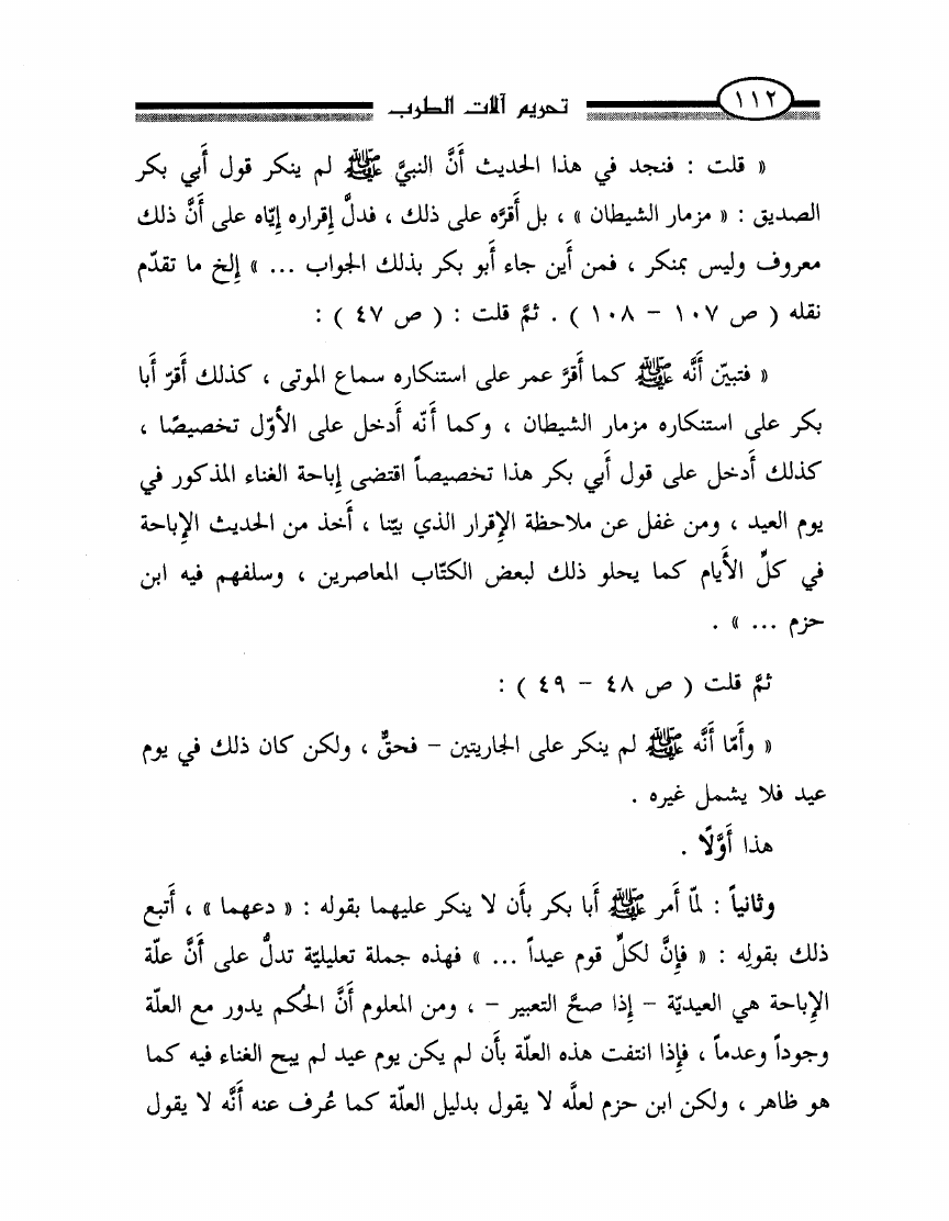 نام کتاب : تحريم آلات الطرب أو الرد بالوحيين وأقوال أئمتنا على ابن حزم ومقلديه المبيحين للمعازف والغنا وعلى الصوفيين الذين اتخذوه قربة ودينا نویسنده : محمد ناصر الدين الألباني جلد : 1 صفحه : 112
