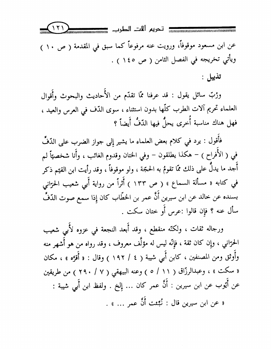 نام کتاب : تحريم آلات الطرب أو الرد بالوحيين وأقوال أئمتنا على ابن حزم ومقلديه المبيحين للمعازف والغنا وعلى الصوفيين الذين اتخذوه قربة ودينا نویسنده : محمد ناصر الدين الألباني جلد : 1 صفحه : 121