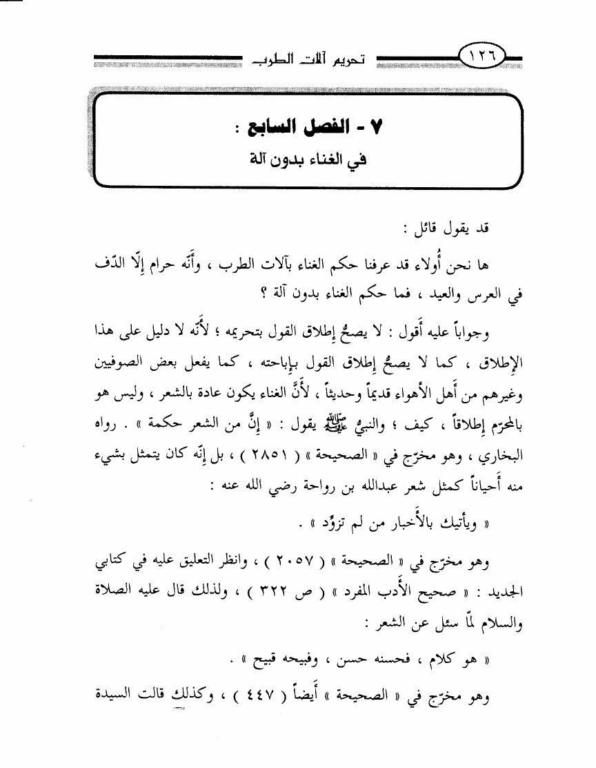 نام کتاب : تحريم آلات الطرب أو الرد بالوحيين وأقوال أئمتنا على ابن حزم ومقلديه المبيحين للمعازف والغنا وعلى الصوفيين الذين اتخذوه قربة ودينا نویسنده : محمد ناصر الدين الألباني جلد : 1 صفحه : 126