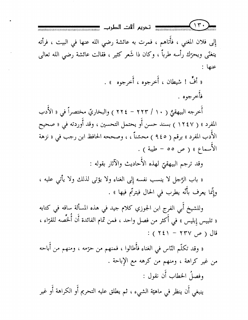 نام کتاب : تحريم آلات الطرب أو الرد بالوحيين وأقوال أئمتنا على ابن حزم ومقلديه المبيحين للمعازف والغنا وعلى الصوفيين الذين اتخذوه قربة ودينا نویسنده : محمد ناصر الدين الألباني جلد : 1 صفحه : 130