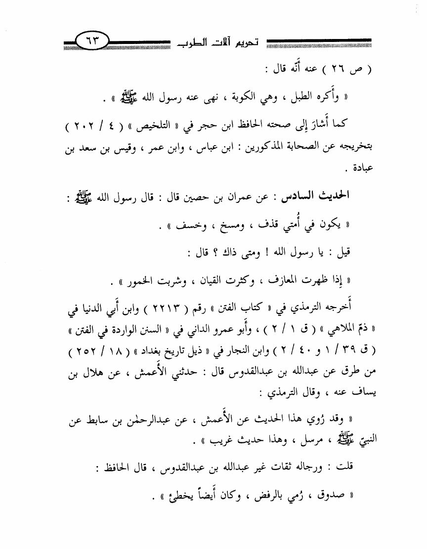 نام کتاب : تحريم آلات الطرب أو الرد بالوحيين وأقوال أئمتنا على ابن حزم ومقلديه المبيحين للمعازف والغنا وعلى الصوفيين الذين اتخذوه قربة ودينا نویسنده : محمد ناصر الدين الألباني جلد : 1 صفحه : 63