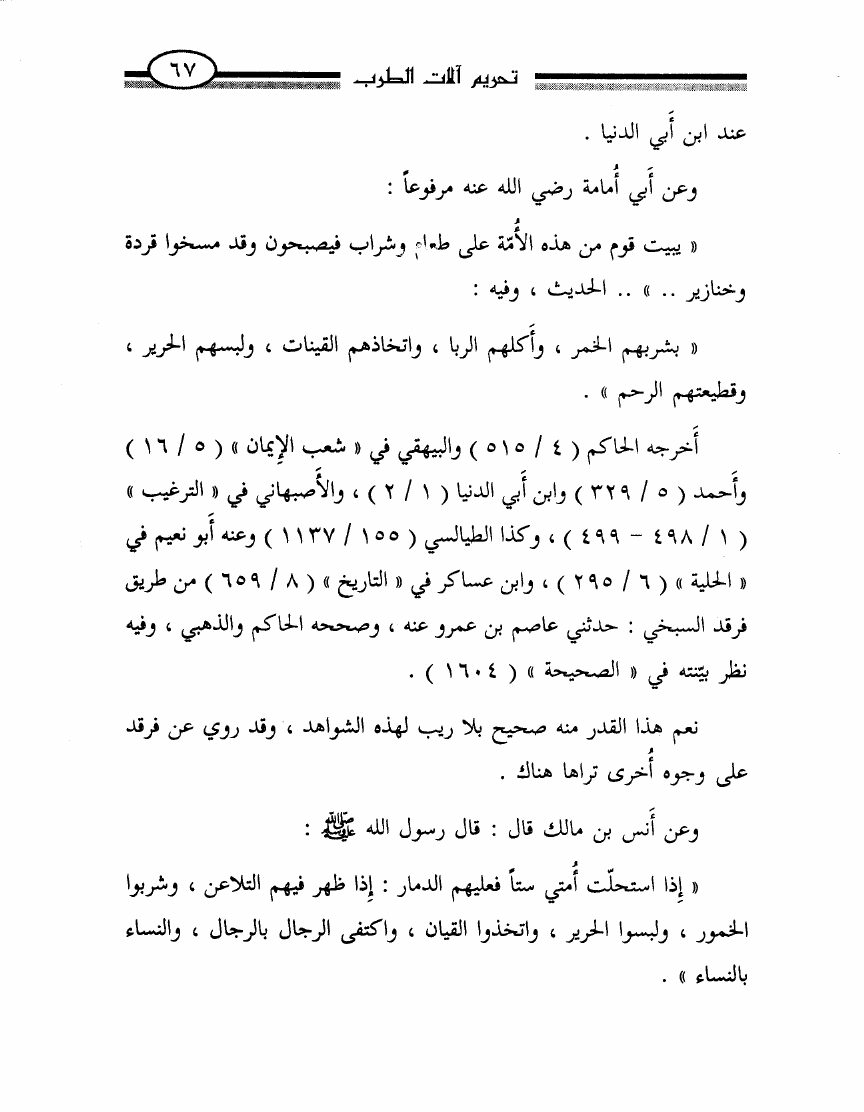 نام کتاب : تحريم آلات الطرب أو الرد بالوحيين وأقوال أئمتنا على ابن حزم ومقلديه المبيحين للمعازف والغنا وعلى الصوفيين الذين اتخذوه قربة ودينا نویسنده : محمد ناصر الدين الألباني جلد : 1 صفحه : 67