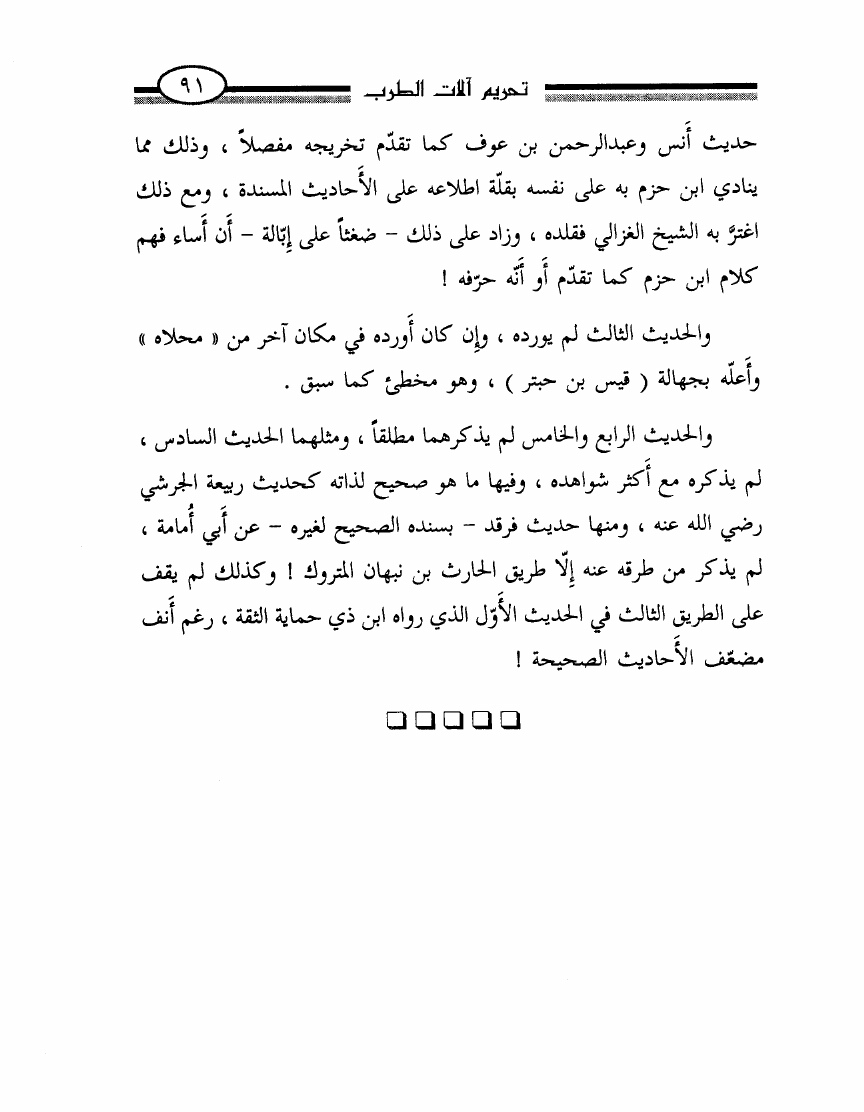 نام کتاب : تحريم آلات الطرب أو الرد بالوحيين وأقوال أئمتنا على ابن حزم ومقلديه المبيحين للمعازف والغنا وعلى الصوفيين الذين اتخذوه قربة ودينا نویسنده : محمد ناصر الدين الألباني جلد : 1 صفحه : 91