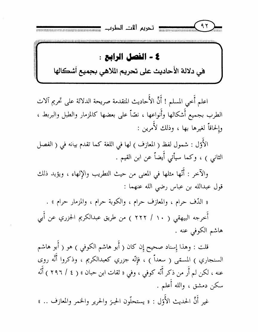 نام کتاب : تحريم آلات الطرب أو الرد بالوحيين وأقوال أئمتنا على ابن حزم ومقلديه المبيحين للمعازف والغنا وعلى الصوفيين الذين اتخذوه قربة ودينا نویسنده : محمد ناصر الدين الألباني جلد : 1 صفحه : 92