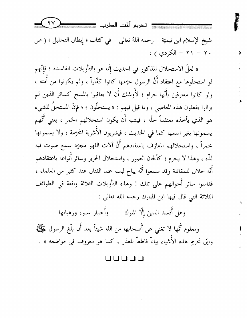 نام کتاب : تحريم آلات الطرب أو الرد بالوحيين وأقوال أئمتنا على ابن حزم ومقلديه المبيحين للمعازف والغنا وعلى الصوفيين الذين اتخذوه قربة ودينا نویسنده : محمد ناصر الدين الألباني جلد : 1 صفحه : 97