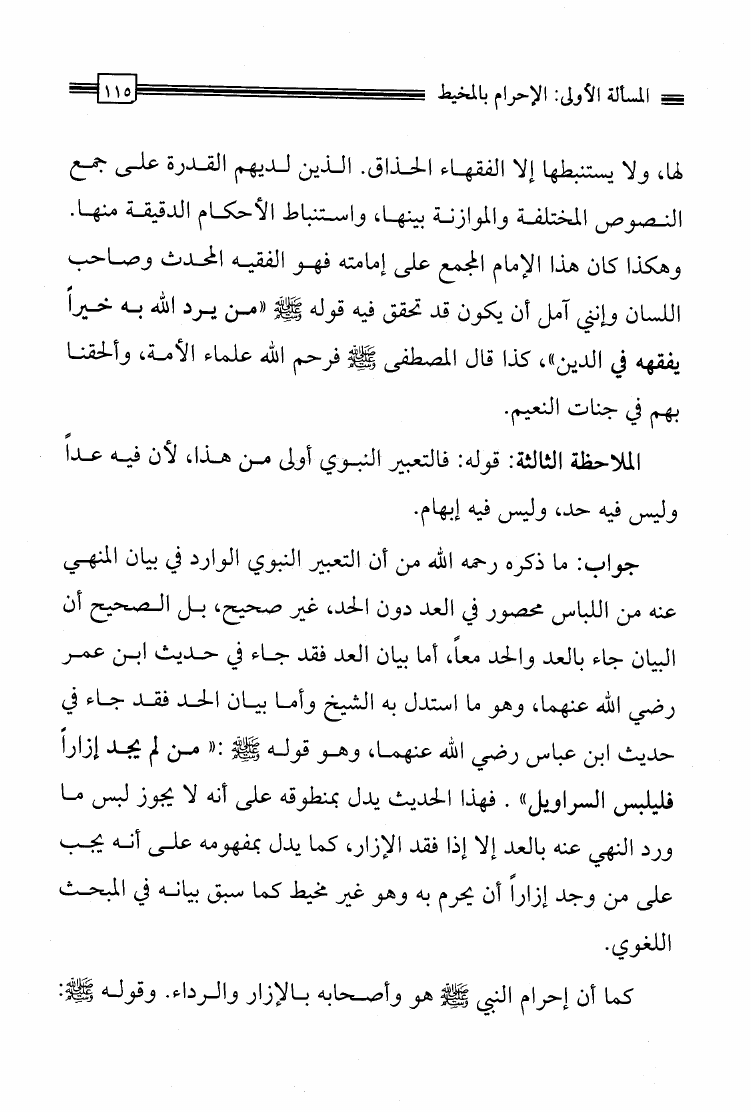 نام کتاب : مشكل لباس الإحرام دراسة ست مسائل من أحكام لباس الإحرام مع تخريج الأحاديث والتعريف بأسماء الألبسة نویسنده : إبراهيم بن محمد الصبيحي جلد : 1 صفحه : 115