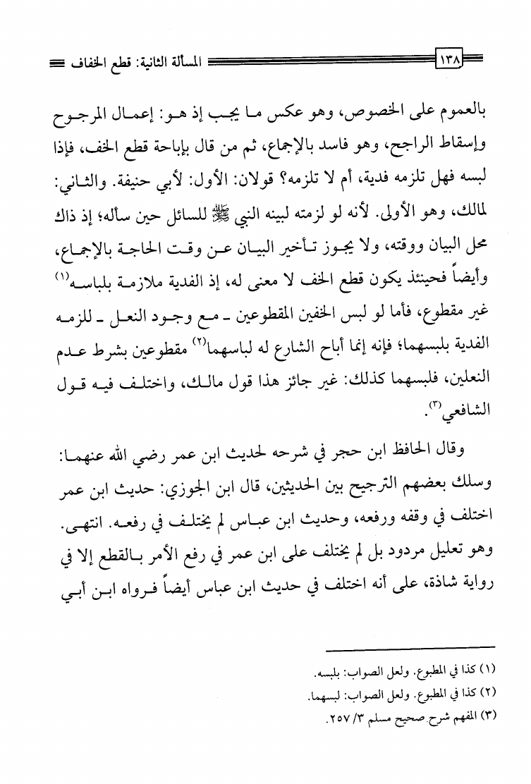 نام کتاب : مشكل لباس الإحرام دراسة ست مسائل من أحكام لباس الإحرام مع تخريج الأحاديث والتعريف بأسماء الألبسة نویسنده : إبراهيم بن محمد الصبيحي جلد : 1 صفحه : 138