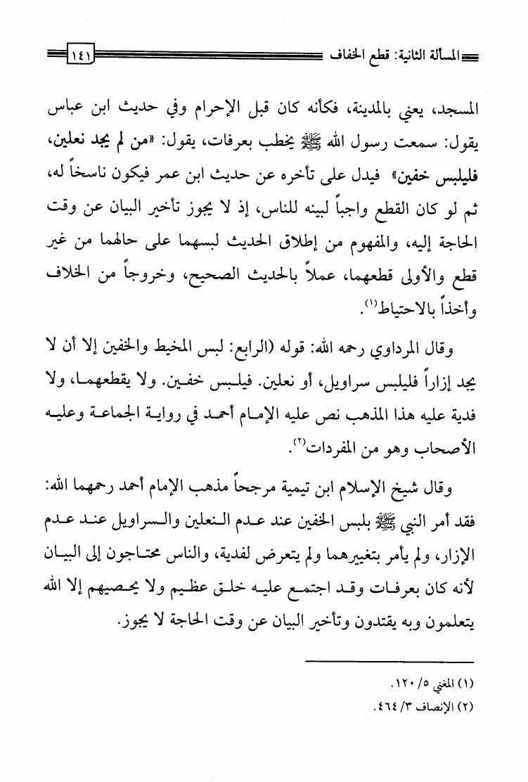 نام کتاب : مشكل لباس الإحرام دراسة ست مسائل من أحكام لباس الإحرام مع تخريج الأحاديث والتعريف بأسماء الألبسة نویسنده : إبراهيم بن محمد الصبيحي جلد : 1 صفحه : 141