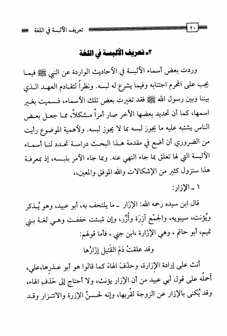 نام کتاب : مشكل لباس الإحرام دراسة ست مسائل من أحكام لباس الإحرام مع تخريج الأحاديث والتعريف بأسماء الألبسة نویسنده : إبراهيم بن محمد الصبيحي جلد : 1 صفحه : 20