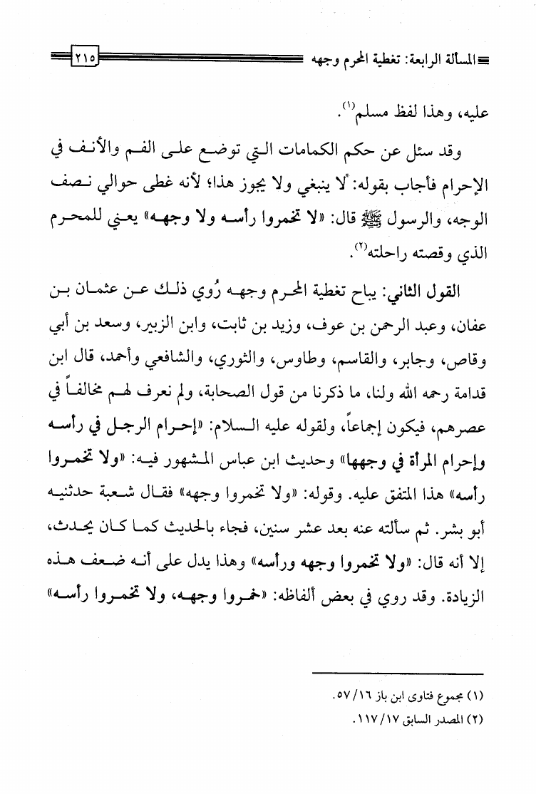 نام کتاب : مشكل لباس الإحرام دراسة ست مسائل من أحكام لباس الإحرام مع تخريج الأحاديث والتعريف بأسماء الألبسة نویسنده : إبراهيم بن محمد الصبيحي جلد : 1 صفحه : 215