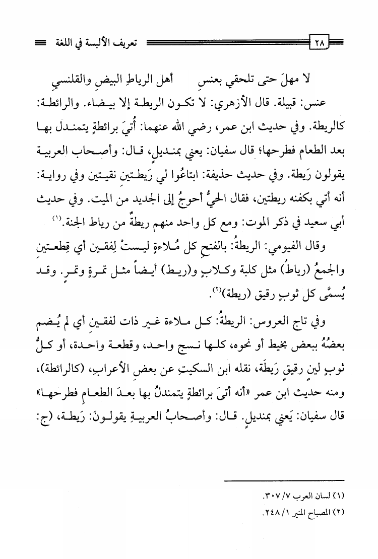 نام کتاب : مشكل لباس الإحرام دراسة ست مسائل من أحكام لباس الإحرام مع تخريج الأحاديث والتعريف بأسماء الألبسة نویسنده : إبراهيم بن محمد الصبيحي جلد : 1 صفحه : 28