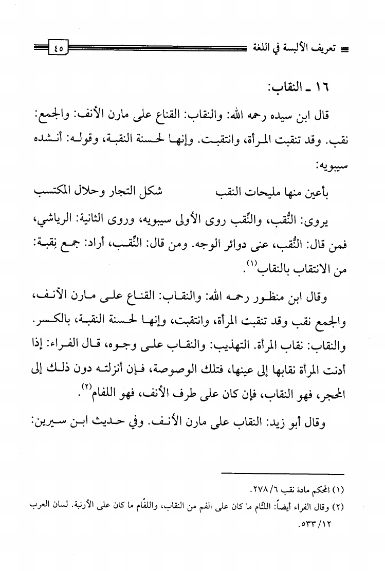 نام کتاب : مشكل لباس الإحرام دراسة ست مسائل من أحكام لباس الإحرام مع تخريج الأحاديث والتعريف بأسماء الألبسة نویسنده : إبراهيم بن محمد الصبيحي جلد : 1 صفحه : 45