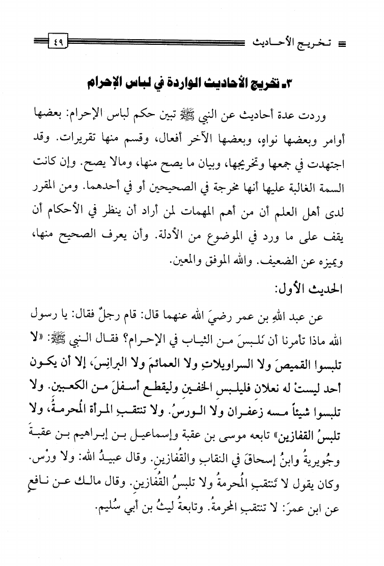 نام کتاب : مشكل لباس الإحرام دراسة ست مسائل من أحكام لباس الإحرام مع تخريج الأحاديث والتعريف بأسماء الألبسة نویسنده : إبراهيم بن محمد الصبيحي جلد : 1 صفحه : 49